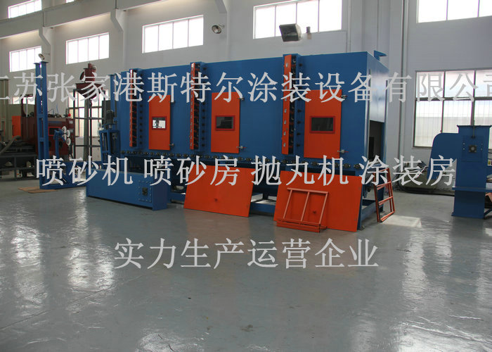 方形坩堝產品內壁處理要求而專門設計的專用型輸送式自動噴砂機,適合需求公司所提供的產品。根據需求公司對產品效率的要求,本機設置一套自動輸送線,共分五段線體。噴砂艙內共設三個噴砂位,工件通過輸送線體帶動步進方式分別在三個噴砂位進行噴砂加工清理,噴砂區域內共布置20支普壓高速噴砂咀,在噴砂區第一個噴砂位布置8支噴咀噴工件內底面,在噴砂區第二個噴砂位布置6支噴咀噴工件內前后側面,在噴砂區第三個噴砂位布置6支噴咀噴工件內左右側面,噴咀可根據加工需要,適當調整其噴射角度,其自動化程度較高。每個工件需間歇進行三次噴砂清理加工,才能完成整個內表面的清理。在出口處設有翻轉機構,用于傾倒內部的砂料,該動作自動完成,無需人工操作。 噴砂技術步驟流程